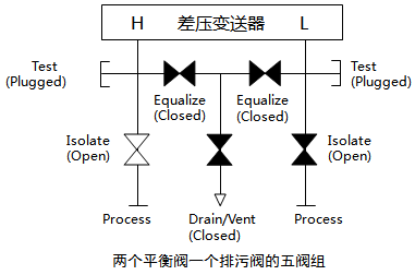 特别说明:五阀组的两个排污阀一般都不用于排污,通常用于排放差压变送器膜盒内的气、液,用它排空后校对差压变送器零点。因五阀组安装与差压变送器之前,通过五阀组排污阀进行排污,只能排放导压管内的气、液,而变送器膜盒有污物却不能排除,故使用五阀组的差压变送器排污宜通过变送器后部的排污螺丝进行。