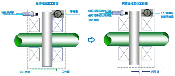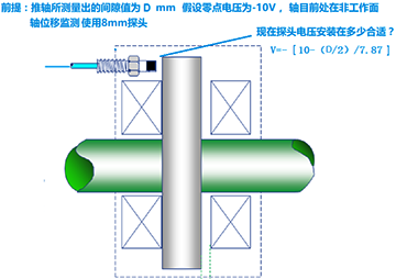 3、保持轴顶在非工作面上,假设3500轴位移通道设置零位电压为-10V,(使用3300XL 8mm系列电涡流传感器进行测量)则轴位移传感器安装电压应该是用零位电压减去刚刚推轴测量出的间隙值所对应的电压的一半。其计算公式为:传感器安装电压V=-[10-(D/2)×7.87],其中7.87V/mm为8mm电涡流传感器灵敏度。这样当轴回到中心点后,轴位移传感器电压即应该为-10V。其他不同的零点位置设计可据此类推,改变计算方法即可。