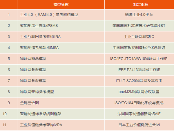 智能制造/工业4.0面向新的生产模式,实现跨企业、跨行业、跨地域的信息集成、应用集成和价值集成。它是一个覆盖信息通信(ICT)、自动化、装备、软件等宽泛领域和技术的“超级”系统工程,目前没有一个学科能够完全覆盖所涉及的方方面面,因此,需要用标准化手段来统一认识和引领发展,普遍的实施方法是通过制定智能制造/工业4.0的参考模型来梳理所涉及的相关标准,进而建立智能制造标准体系。IEC是制定智能制造/工业4.0国际标准的重要阵地,在IEC标准化管理局(SMB)系统评估组SEG7关于智能制造架构和模型的报告中列出了众多标准化组织已制定的11种参考模型和参考架构,具体名称如表1所示。
