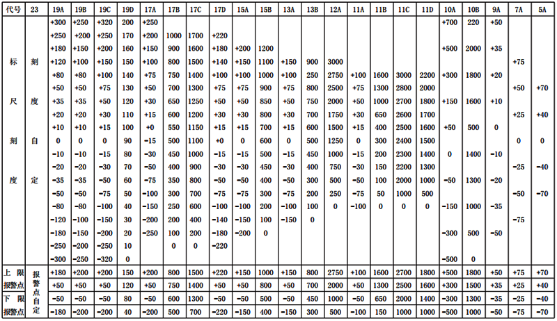 4、电接点采用超纯氧化铝管作绝缘体,通常电极点数有5点、7点、9点、10点、11点、12点、13点、15点、17点和19点几种。不同的测量点数电接点水位计对应的标尺刻度和报警值如下:
