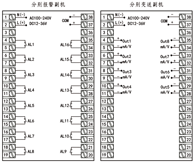 [2]:继电器分别报警输出(八路巡检仪每1路输入对应2限报警,16路巡检仪每路输入对应1个报警)