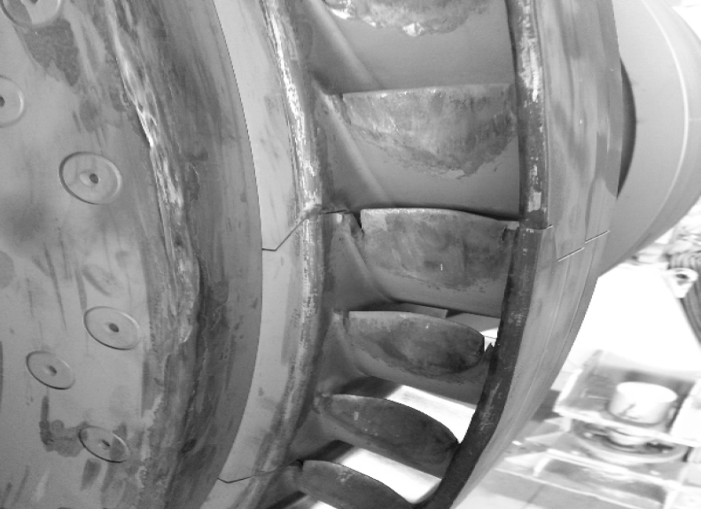 近日6号机组运行负荷350MW,主蒸汽温度537℃、压强13MPa,再热蒸汽温度536℃、压强1.79MPa,凝汽器真空A侧压强98kPa,B侧压强99kPa,机组各轴瓦(包括推力轴瓦)温度、振动均显示正常,润滑油油温正常,主机轴向位移+0.27mm,正常。时间:19:21:33,6号机组汽轮机跳闸,锅炉MFT,跳闸原因显示为汽轮机轴向位移超过ETS主机位移保护跳机值(+1.0mm/-1.0mm)。停机过程中,汽轮机缸体、轴封、轴瓦没有明显异声。事后检查6号机组运行参数历史曲线,发现汽轮机跳闸前,时间:19:21:33主机轴向位移由+0.25mm逐渐减小,时间:19:22:03,2号轴瓦振动瞬时突升至X向97.42μm,Y向89.56μm后回落。时间:19:22:54,轴向位移从-0.22mm瞬间大幅变化,最大至-1.85mm。时间:19:23:02,6号机组汽轮机跳闸,此时轴向位移又瞬时变化至+0.25mm。时间:19:23:15,推力轴瓦非工作面瓦块温度最高升至123.9℃。根据运行参数的变化,初步断定汽轮机通流部分发生故障,造成了转子推力异常变化,推力轴瓦非工作面瓦块磨损,因此申请机组调停检查。停机后,对高压缸解体检查,发现有下文所述的缺陷。