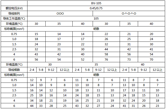 BV-105耐热聚氯乙烯绝缘电线的载流量对照表