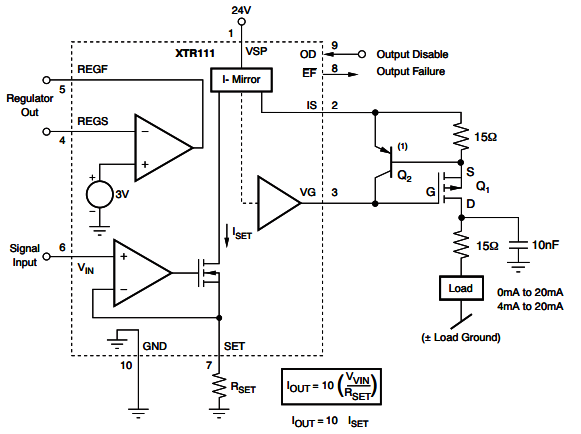 而下图所示为TI公司XTR111内部结构框图,这种电路非常适合与传感器输出直接相连构成标准的4-20mA变送器。