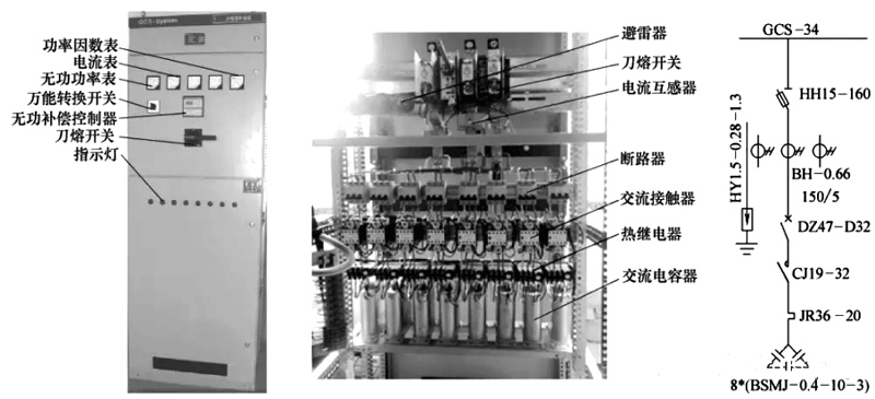 电容补偿柜的作用是提高负载功率因数,降低无功功率、提高供电设备的效率。电容补偿柜是否正常工作可通过功率因数表的读书判断,功率因数表读数如果为0.9左右可视为工作正常。合上刀熔开关和断路器,无功功率补偿控制器根据进线柜电压和电流的相位差输出控制信号,控制交流接触器的闭合和断开,从而控制电容器投入和退出。下图给出了其实物结构和一次电路主电路图。