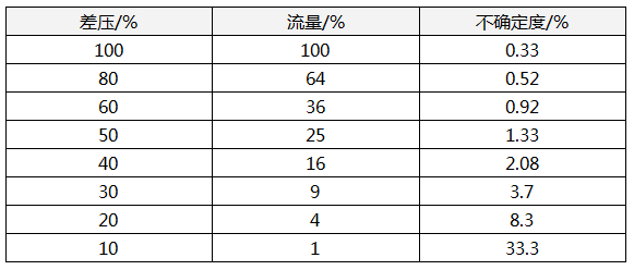 从计算可知在流量计三分之一量程时,差压值仅是最大差压的九分之一,这时差压变送器已经很难反映出流量的变化了。如反映在流量计刻度及记录纸上,则所测流量值越低,同一流量增量的分度线越密,几乎难以分度。现以一台差压为60kPa 对应20000kg/h的流量计为例,假设该差压变送器的综合误差为1.0%,按GB/T2624-2006标准中不确定度估算方法,来计算各流量时的不确定度(为便于理解和比较,表中全采用百分数),即: