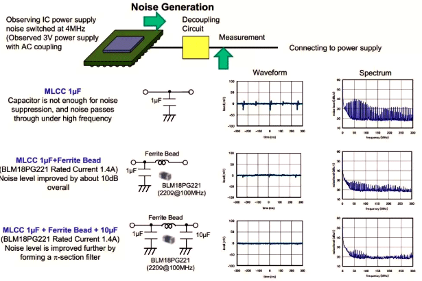 Murata公司的资料中有使用铁氧体磁珠进行噪声抑制和改善的例子。如下图所示,可以看到,磁珠对于IC噪声有明显的隔离作用。