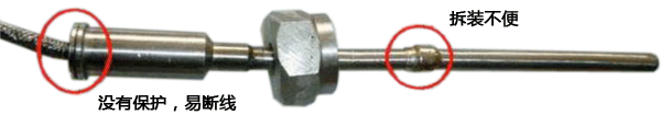 测温导线耐油、耐腐蚀、耐热性能比较差;长期在油浸的环境中,容易出现变硬、变脆、外皮开裂等现象,缩短其使用寿命;长期振动会导致导线在传感器根部断开见(图1、图2)。经现场检查发现,根部断线的故障几乎占了测温电阻故障总数的50%。