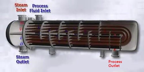 迄今为止,壳管式换热器是石化工业中最常见的换热器类型,因为它适用于低压和高压应用。如图所示,它由一个外壳和一束管子组成,这些管子要么是直的,要么是“U”形的。一种流体流过管子,另一种流体流过管子周围的外壳,以在两种流体之间传递热量。这组管称为管束。