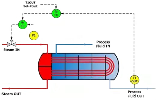 加热是通过在管侧通入蒸汽来实现的,通过管道的蒸汽越多,传递给过程流体的热量就越多,反之亦然。蒸汽流量F2(操纵变量)的控制是通过调节安装在蒸汽入口侧的调节阀来实现的。
