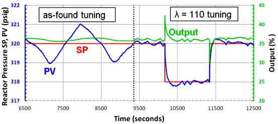 原来的整定导致PV上出现一个±1PSIG的循环。周期上的尖角表明调节周期因控制阀中的死区而变得复杂。仔细检查显示死区约为控制器输出的0.7%。使用λ=110秒的Lambda整定可以消除大的整定周期;我们只剩下死区引起的小极限周期。为了测试Lambda整定回路的稳定性,操作人员无法进行载荷步骤。然而,它们可以方便地修改设定值。PV在大约110秒内穿过SP,并在返回非线性极限循环之前进行小的超调。