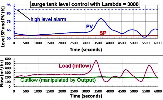 原来的整定是快速和振荡的;相反,Lambda整定没有系统振荡,除非负载振荡。在这种情况下,我们选择了一个大的Lambda来吸收变化性;也就是说,将被操纵变量的变化最小化。Lambda=3000是最慢的调整,它将使PV远离最坏情况下流量变化的警报。注意,尽管在工厂启动期间,进水量发生了很大变化,但仍有稳定的流出量。
