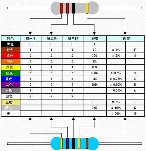 快速读数首先需要先记住色环颜色代表的数字:棕色代表数字1;红色代表数字2;橙色代表数字3;黄色代表数子4;绿色代表数字5;蓝色代表数字6;紫色代表数字7;灰色代表数字8;白色代表数字9;黑色代表数字0;金、银色表示误差。金色偏差范围在±5%。银色在±10%。大家可以记住色环电阻识别口诀:棕一红二橙是三,四黄五绿六为蓝,七紫八灰九对白,黑是零,金五银十表误差。或者对照下面的表格。