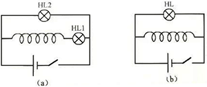 图十二为两个实验电路,在图(a)电路中,当开关闭合时,灯泡HL2马上变亮,而灯泡H1慢慢变亮,然后亮度不变;在图(b)电路中,当开关闭合时,灯泡HL马上变亮,开关断开时,HL不会马上熄灭,而是慢慢熄灭。