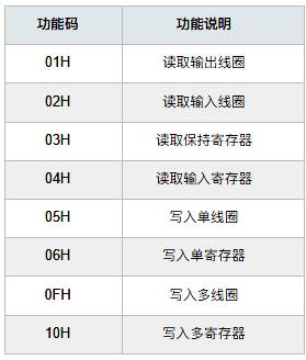 MODBUS协议同时规定了二十几种功能码,但是常用的只有8种,用于对存储区的读写,如下表所示: