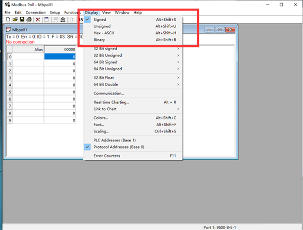 点击Display可以设置数据的显示方式,默认为Signed方式(16进制无符号二进制),数据范围为-32768~32767。