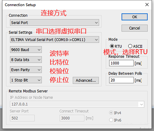 端口主从机分别选择我们虚拟出来的com10和com11端口,其他选项如波特率9600,比特位8,校验位1,无等价位等可以保持不变,然后点击确定进行连接,未连接成功窗口第二行会给出提示信息。