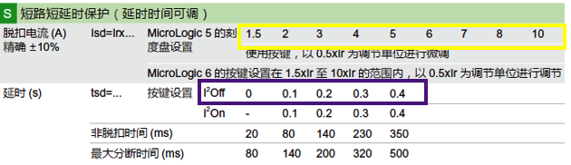 3、图5脱扣曲线中黄色方框内代表短路短延时保护整定电流范围,紫色方框代表延时时间的可调值。