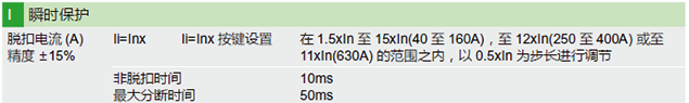 两条斜曲线代表热保护的最大动作时间(上)和最小动作时间(下),Ii=8In代表磁脱扣动作电流值,最右边绿色区域代表能量脱扣,动作阈值25In,动作时间小于10ms。