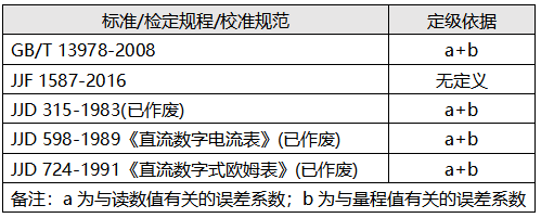 根据JJF 1587-2016,现在已使用最大允许误差替代准确度等级用于表达数字多用表技术性能。但GB/T 13978-2008《数字多用表》之5.14.3给出:以规定基本测量不确定度的系数a和b之和作为等级指标。已作废的JJG 315-1983《直流数字电压表》之6.2、6.3给出:准确度等级以基本量程误差系数(a+b)的大小和年稳定误差来划分。各标准对数字表等级定义主要依据如表1所示。