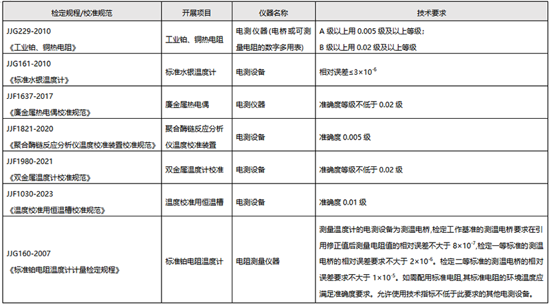 本文以直流电阻信号为例,介绍热学计量中常见项目电测仪表的基本情况。标准铂电阻温度计是-196℃~660℃温度范围内常用的标准器具,是开展工业铂、铜热电阻温度计检定、标准水银温度计检定、温度变送器校准、精密测温的主标准器。用标准铂电阻温度计作为主标准器开展量值传递时,需配接电测设备用于测量其电阻值。常见检定规程/标准规范中对电测设备的要求如表2所示。