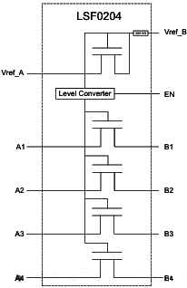 LSF系列由双向电压电平转换器组成,工作电压范围为0.8至4.5V(Vref_A)和1.8至5.5V(Vref_B)。该范围允许在无需方向端子的情况下,在开漏或推挽应用中进行0.8至5.0V的双向电压转换。LSF系列支持最高100MHz传输速度的电平转换应用。